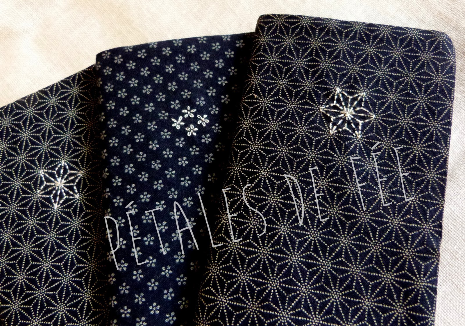 ou tissu bleu encre motif traditionnel Asanoha :Étoiles en pointillés avec une étoile centrale rebrodée à la main