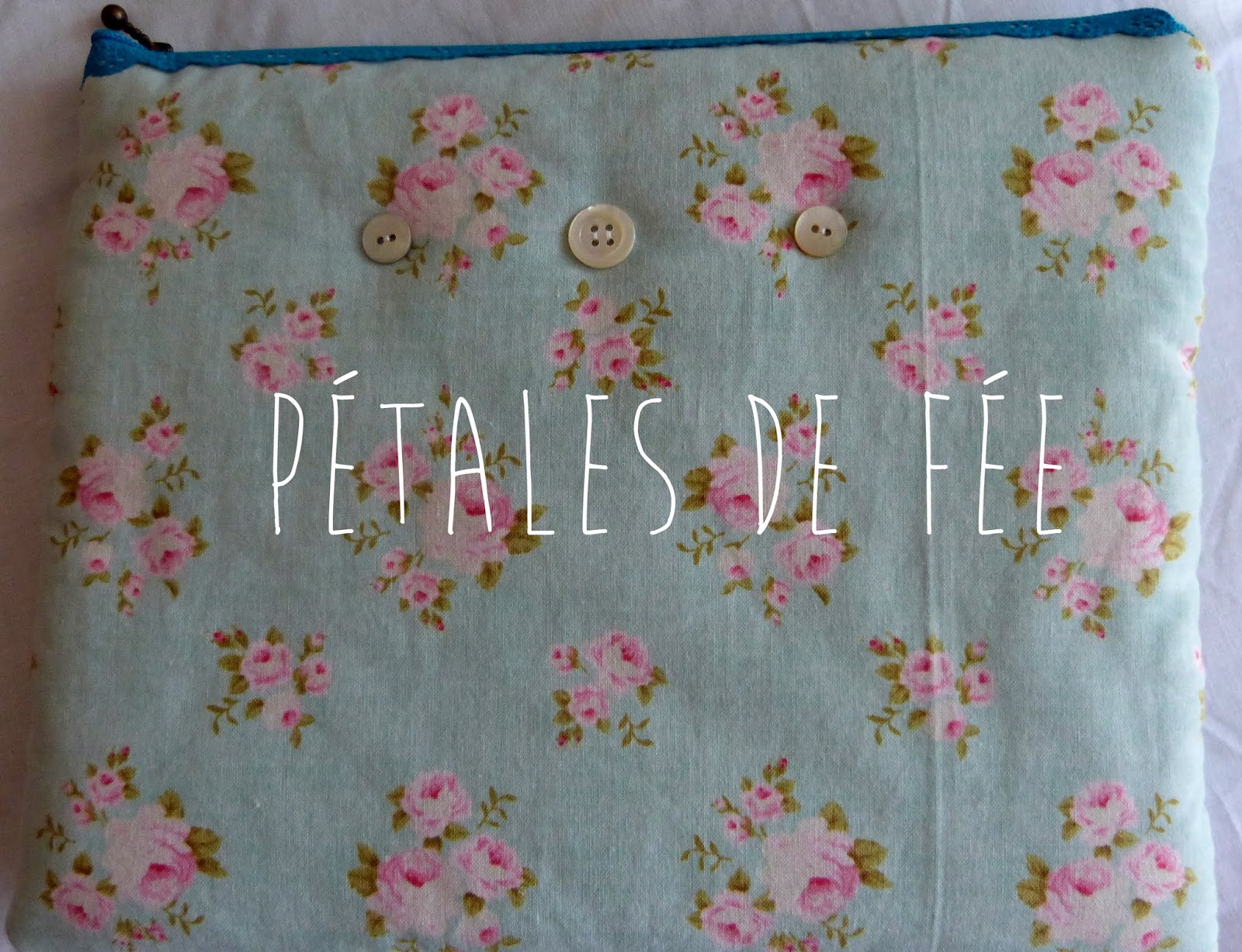 Coton gris bleu avec bouquets de roses anciennes, doublé, ouatiné, fermeture éclair dentelle.