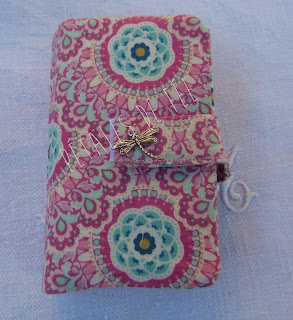 Coton bleu avec motifs oiseau et fleurs, coton turquoise à pois, bouton de nacre bleu.